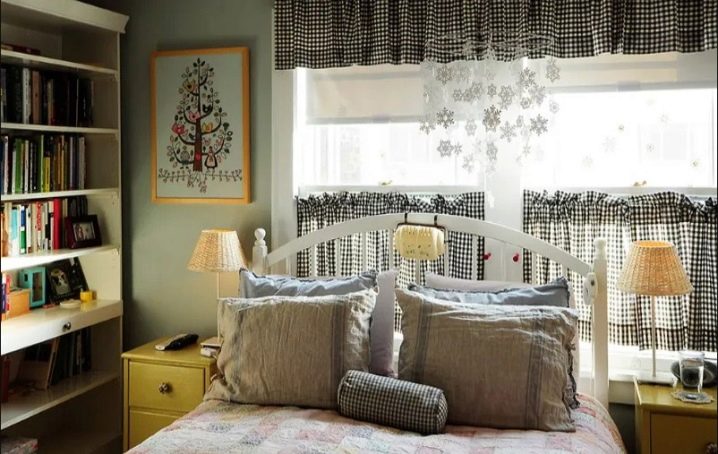 The complex geometry of the windows is often found in country houses on the top floor. The non-standard shape of the window makes it difficult to choose curtains and the method of fastening the eaves, because it itself attracts attention and requires simplicity and organic solutions. On an oblique window, you should not choose too complicated curvy curtains - it is more difficult to cope with them, besides, they dim the lights. The fabric for dormer windows is better to choose a lighter one, so that it keeps its shape well and does not slip from the eaves.