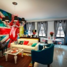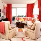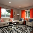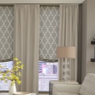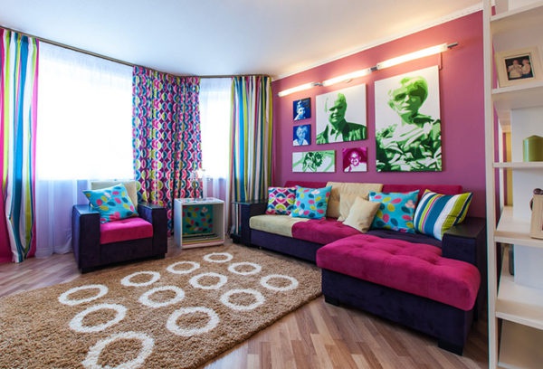 - Geometric and graphic drawings of curtains suitable for living in the style of Pop Art, which is all bright. Perhaps the use of a large print with the image of a film star. Due to its drawing and color, Pop Art drawings always attract the eye and create dynamics in the interior.