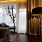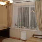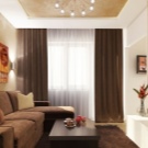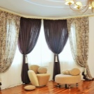 Curtain fabric echoes the color of the furniture and is a rather dark active spot, but does not over-draw all attention to itself. It is possible to reverse the contrast between the walls and the curtain. Flying translucent fabrics do not prevent the light from entering the room, creating a halo of airiness and lightness.