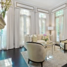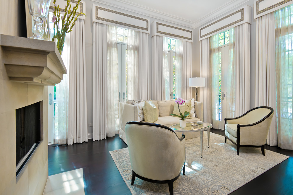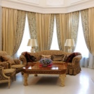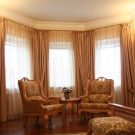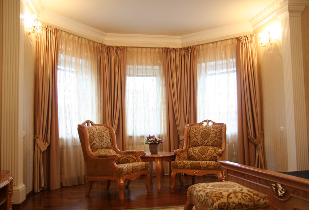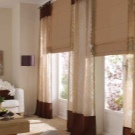 The combination of classic straight curtains with a Roman curtain on two windows is striking in its simplicity and brevity.