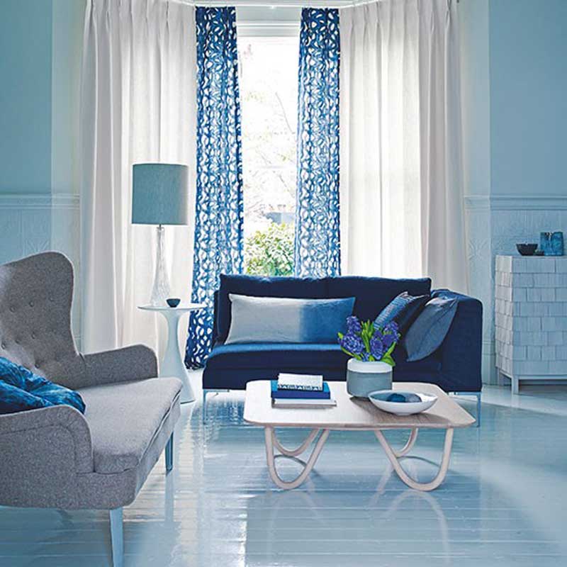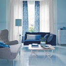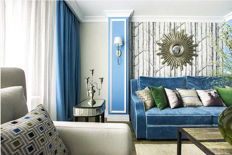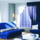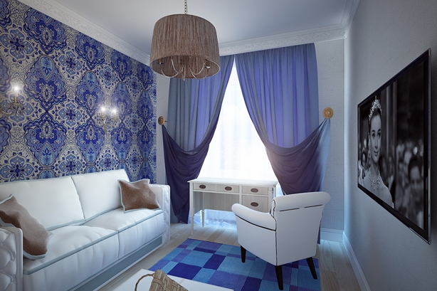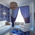 Curtains with gold and silver splashes will save the daily routine. However, so that the metallic does not look cheap, it is better not to use it in other interior items. The golden rule is that it is better to fail than to overdo it! Golden and silver accents on the curtains will be especially noticeable in combination with blue wallpaper. It is in this color pair that both shades open up their depth, and the contemplation of a light shine will certainly lift the mood of the landlord, bringing a bit of a holiday into his life.