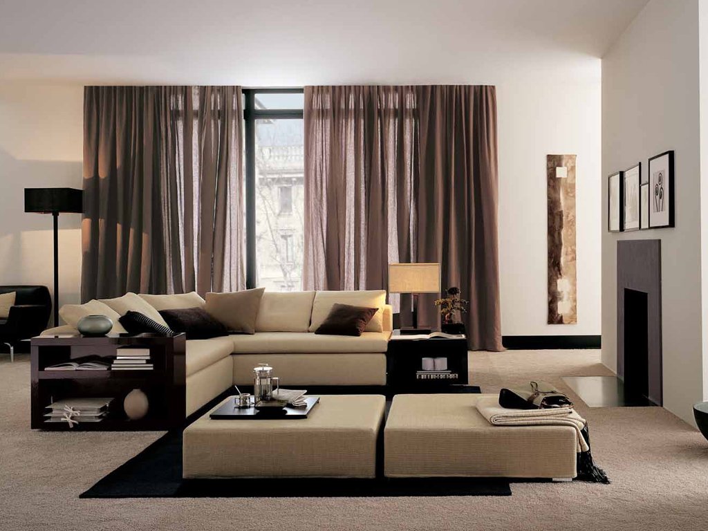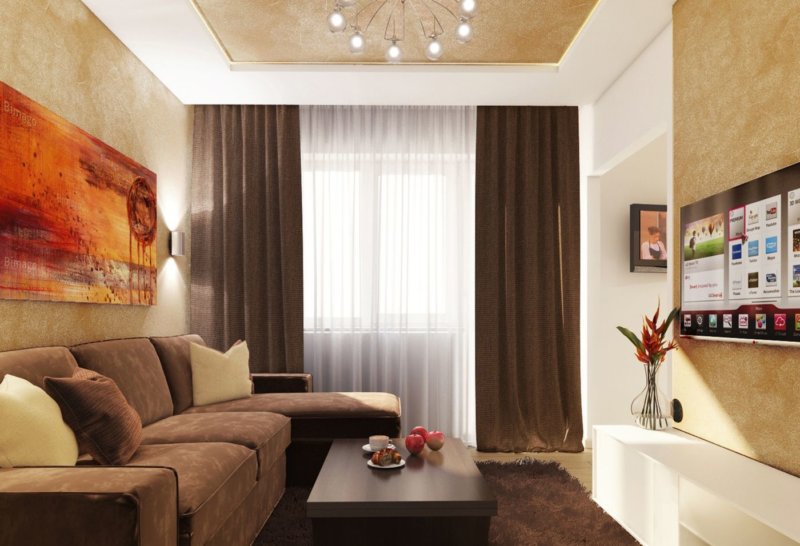 In a fashion simple forms and textures.therefore, a good curtain to the floor without additional details would be a good option.It is worth forgetting about lush curtains with active fittings and lambrequins. The basic rule of modern design of curtains for the living room is conciseness and elegance.