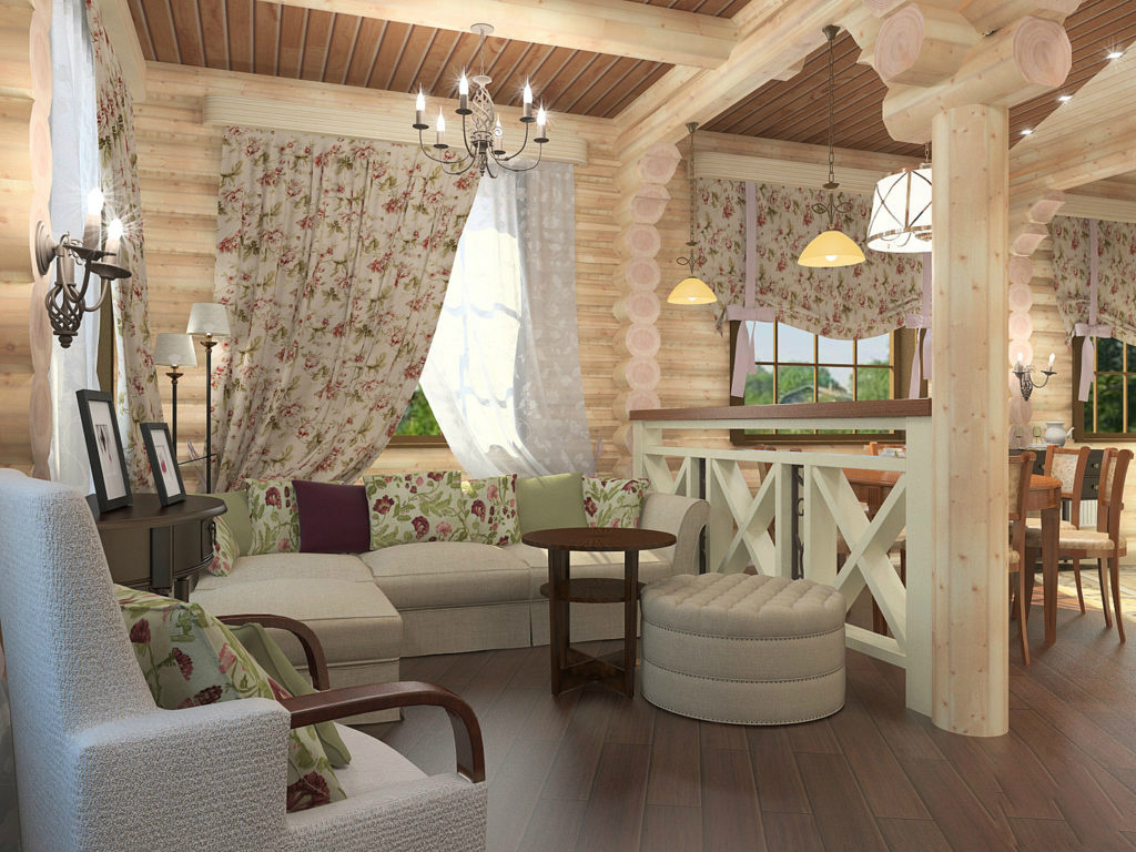 - For varieties of country style is to choose curtains, the pattern of which repeats the print of the rest of the textile room. As a rule, preference is given to intricate plant patterns of small size. Scandinavian style requires lightweight straight curtains. Models of curtains, as a rule, simple and monochromatic, like the rest of the interior.