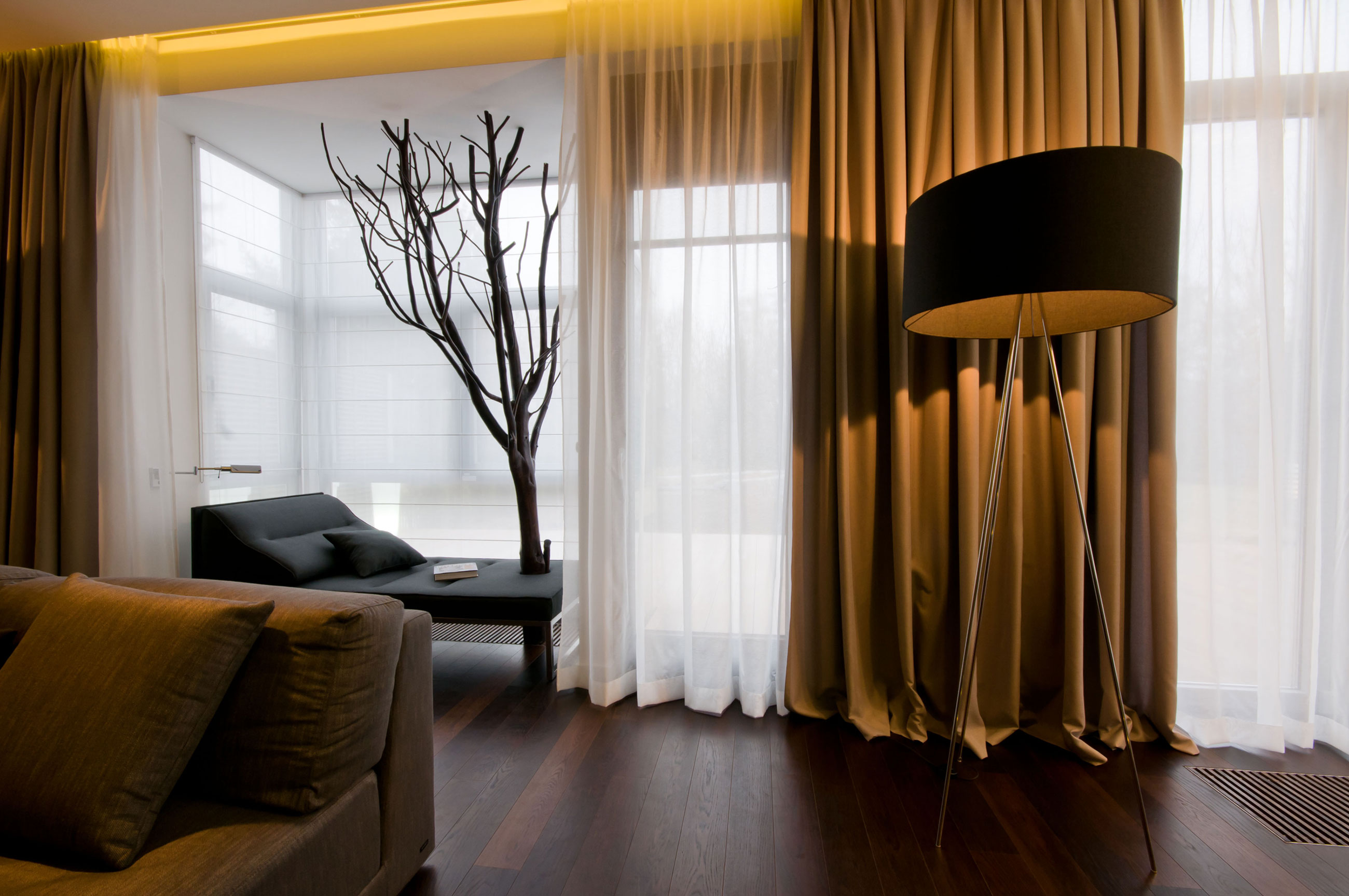For rooms made in modern styles, you can use curtains made of heavy non-woven materials. They can be straight and go to the floor, creating the necessary array of fabric. Such curtains due to their density can look very stylish. However, they almost always eat up some of the space, so they won't work for small living rooms.
