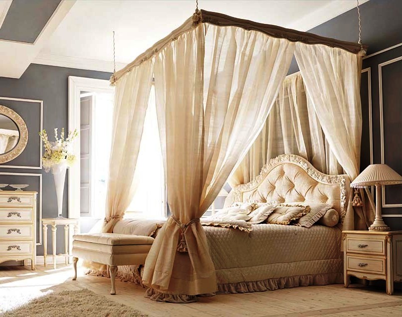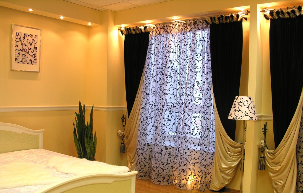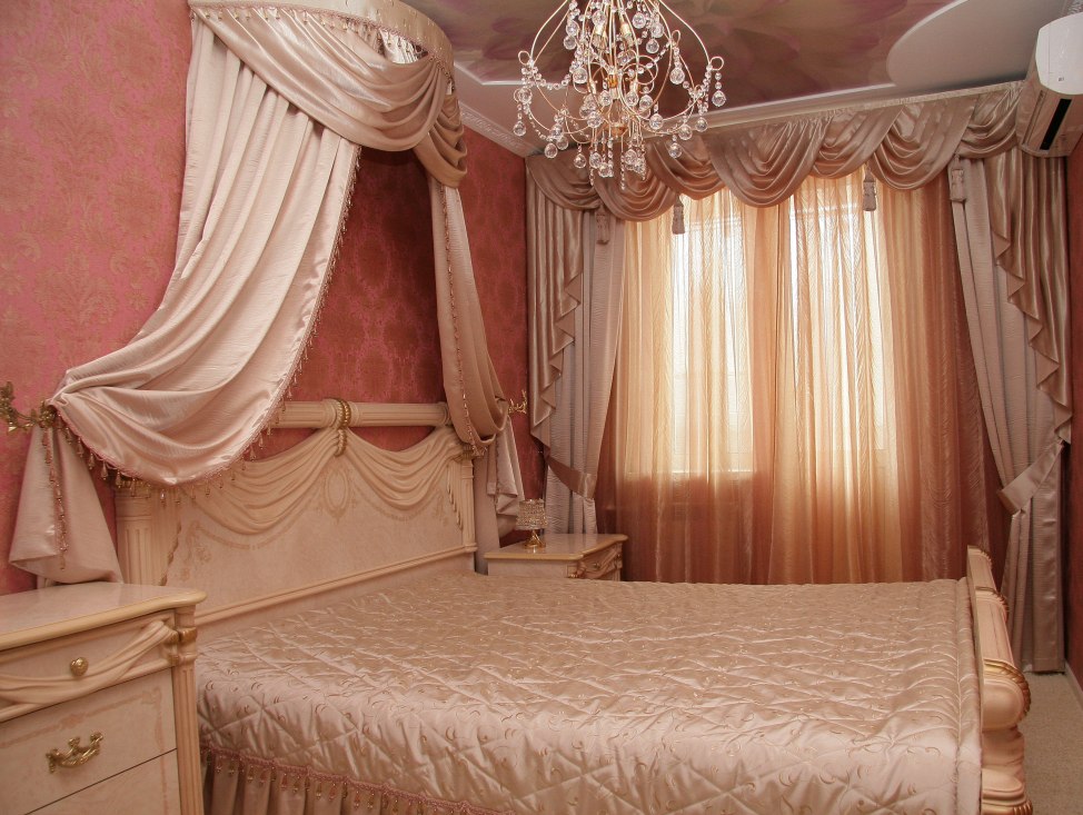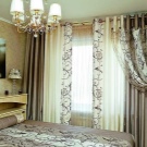 It is necessary to choose it considering in what style the design of the bedroom is made. For baroque, of course, flax or cotton will not work, and Country will look ridiculous with draperies made of taffeta, with guipure and organza on the windows.Tiebacks for curtains also differ in design and are matched to fabrics and in accordance with the environment.