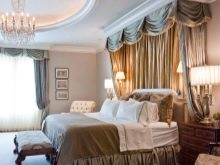 - Baroque. Chic, glitter, luxury - these are the main components of this modern style come from royal times.Gold here is not only not superfluous, but is also welcomed and leads. In addition to the eaves, gold or bronze colors are present on the curtains, echoing in thick fringe on the lambrequins, decorated with selections for curtains. The abundance of lace, rhinestones, velor, velvet, silk - truly royal taste and appearance. The interior contains elements such as decorative pillows, bedspreads with frill around the perimeter, a lot of folds and complex draperies. Furniture in any shades of white (vanilla, ivory, dairy) or dark (chocolate, cherry). Textiles on the windows look especially regal in shades of Burgundy wine, deep dark blue, coffee with gold, dark green.