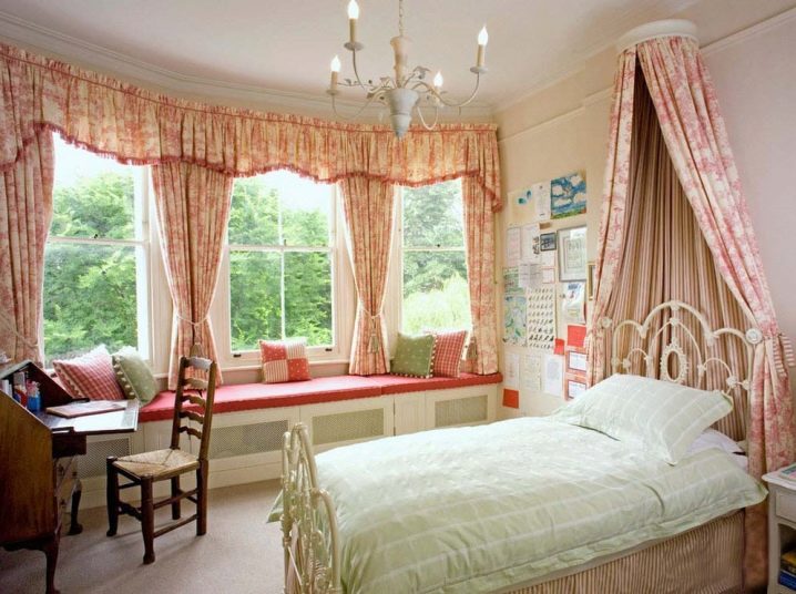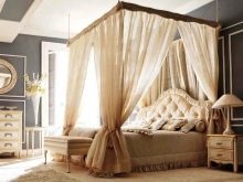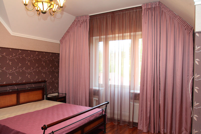Each type of eaves has its own design features and fixtures - single or double,with hooks or clothespins, with rings or without any clips. In the bedroom, a curtain rod with curtains is not necessarily located in front of the window. Covering the bed from prying eyes with a cloth is a great idea for a bedroom.