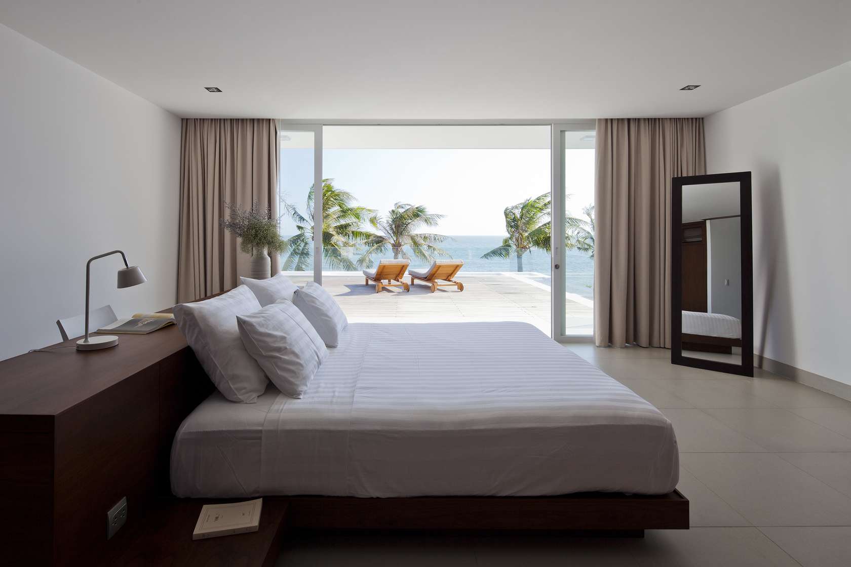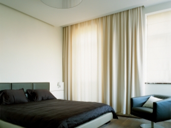 - Minimalism - a combination of inconspicuous tones and a uniform finish. Maximum free space. Nothing superfluous and fanciful. Curtains in the interior of such a bedroom of soothing shades, light, not burdened with lambrequins and drapery. Translucent fabrics of vanilla, white, cream color are preferred.