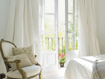 - Provence - one of the most popular styles preferred for the bedchamber. This is due to its romantic design. On the windows in the Provencal room, linen or cotton curtains complete with weightless curtains are appropriate, beautiful floral motifs in white-blue, white-pink-greenish, and milky-purple combinations prevail.