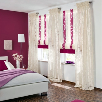 If your bedroom is not one, but two or more windows of different modifications, then the curtains can be used not the same models. It looks interesting the same fabric on different mounts. For example, a combination of roller blinds and curtains.