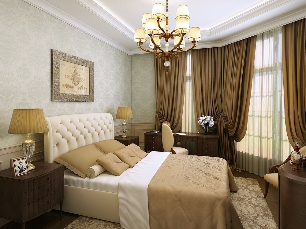 - Classic style. The classic combines beauty and convenience with elegant curtains without intricate designs and decorative elements. It is presented by sets of curtains from dense fabrics with translucent tulle with a dense lambrequin and pickups. For fabrics, it is most often jacquard, velvet, brocade and silk. One-type textiles make out the whole bedroom. Different shades are allowed, but not a variety of textures and shapes. Exquisitely look wine-colored curtains in combination with light-colored furniture.