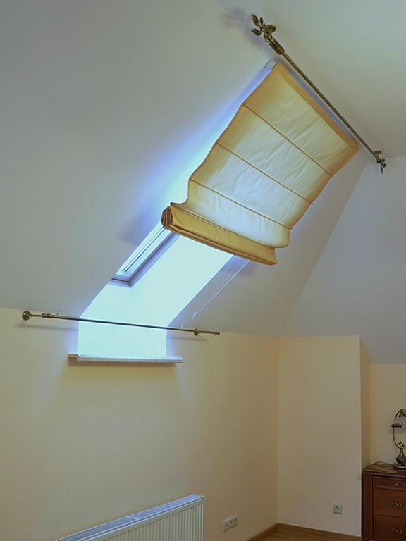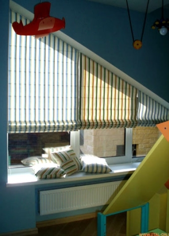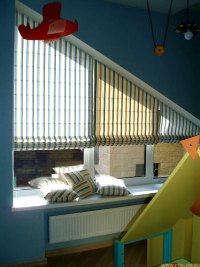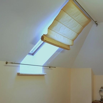 For windows with non-standard geometric shapes, the mounting method is developed taking into account the layout and individual features of the window opening. For example, the cornice of oblique Roman blinds is set at an angle; they are ideal for skylights.