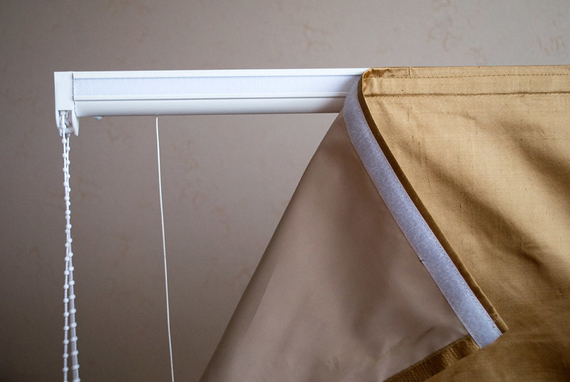 - Fastening the curtain to the eaves with velcro. This method allows you to easily remove the canvas and fix it back, which is very convenient if the location of the curtain involves its frequent cleaning of dirt. In addition, you can simply replace the canvas, if it becomes unusable or the owner just wants to change the interior.