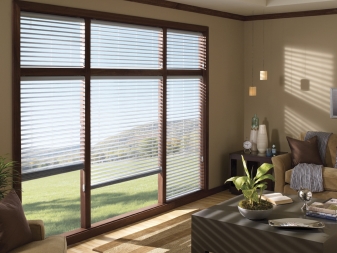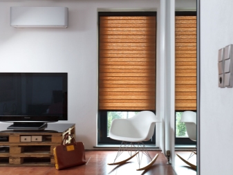 - Mini-cassette.Such systems completely repeat the size of the window, with any protruding parts missing. This option was specially developed for windows from plastic with the rotary and folding mechanism of opening. The material of the box and guides is laminated aluminum. Attracts the brevity of the system: it does not have a circuit to control and even other protruding parts. This design can be installed independently, for which it is not necessary to drill the frame.