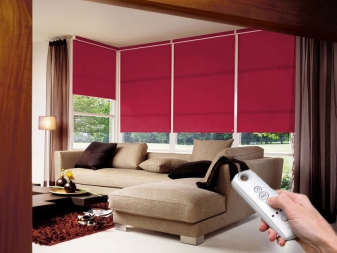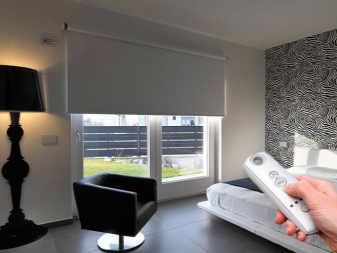 - Remote Control by electric drive. Typically, such a mechanism is used in cases where manual control is impossible due to the location of the window beyond the reach of the curtains or with a ceiling arrangement of roller blinds fasteners.