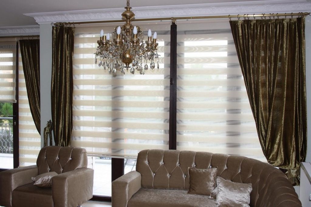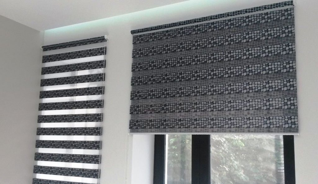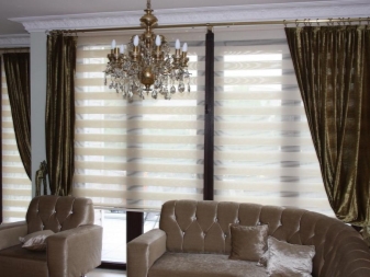 - Rolled curtains of the day-night model made of cloth with alternating transparent and opaque stripes. Created on the principle of blinds, allow you to adjust the flow of light penetrating from the outside. By moving different stripes relative to each other, sufficient illumination, twilight and full shading can be achieved.