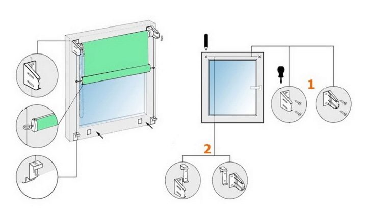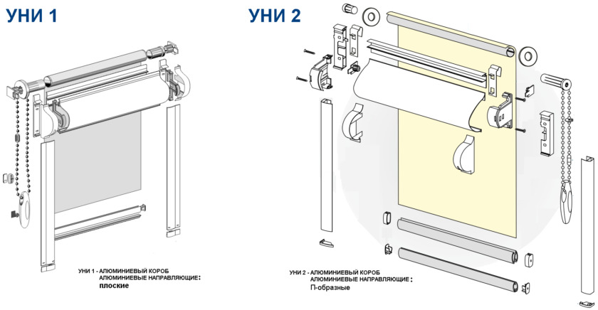Uni fastening system (unified) allows you to install roller blinds in any possible way: on tape, screws or spring brackets. With different types of fastening, the basis of the mechanism is of the same type in any case: a canvas wound on a roller with a control system.