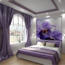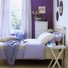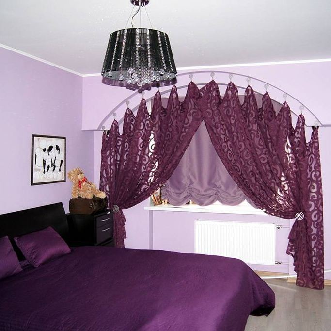 In addition to curtains or curtains for a compact bedroom fit purple wallpaper. If it is necessary to arrange a room for a romantic and sensual girl, then it is recommended to opt for violet curtains. The textile material used for curtains may not only be monophonic. Lilac curtains with purple, mauve, blue and pink lines or patterns will be a colorful decoration.