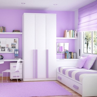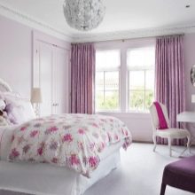 Experts report that the lilac color is the epitome of the unusual and unearthly. For decoration of small bedrooms, organza, muslin, nylon and a curtain veil are ideal as a material for curtains.