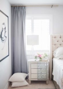 Short curtains that cover only half of the window look neat and cute. They are fine suitable for a bedroom in the style of "minimalism". This design option is recommended for small bedrooms. Curtains can be collected and fixed with beautiful ribbons, decorated with bows if desired. Add short curtains with lambrequins of a more saturated or dark shade.