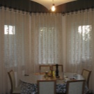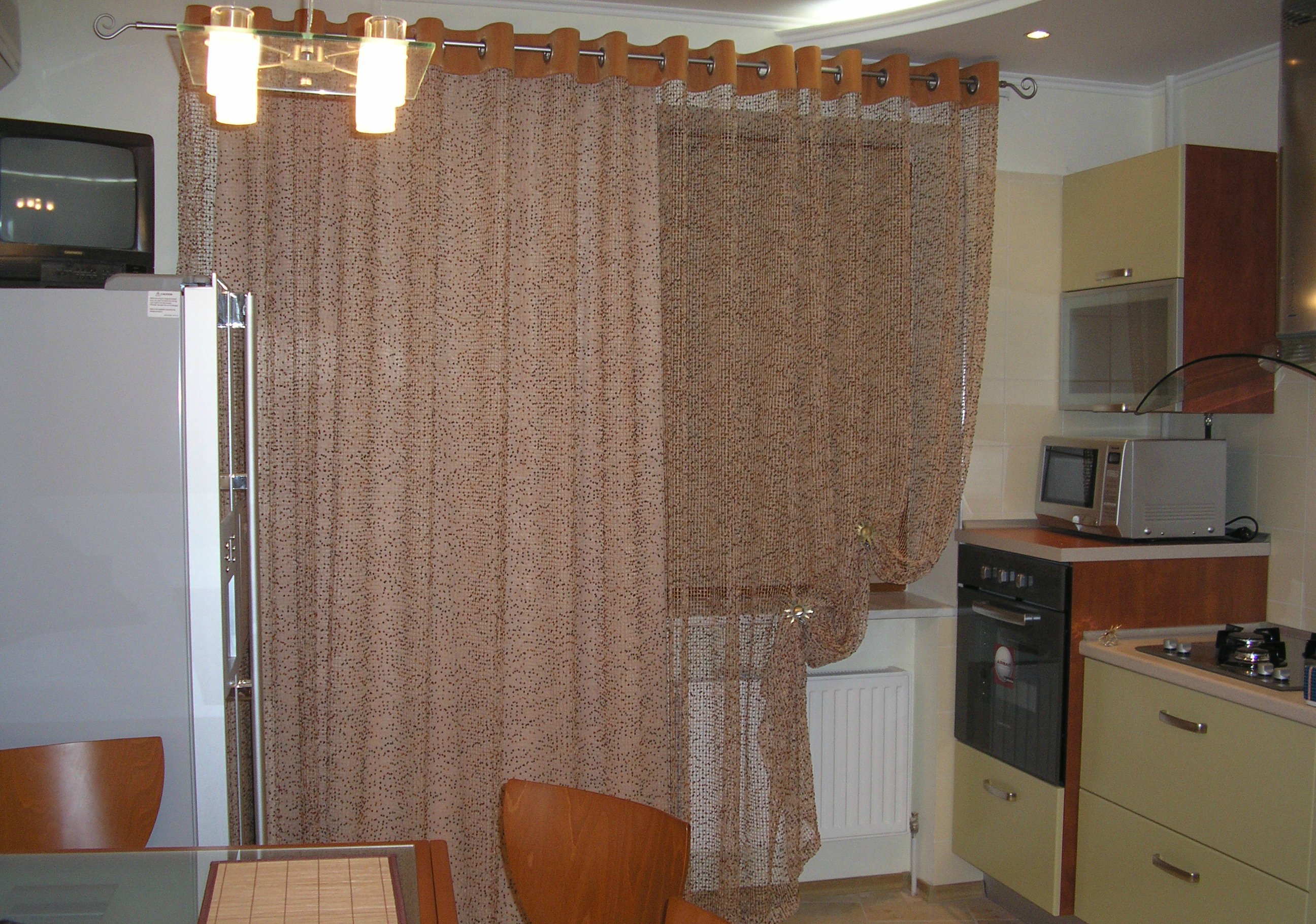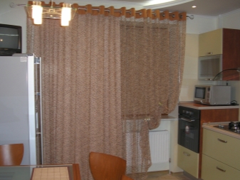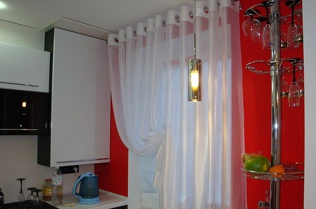 - The same example is a clear proof of how even the smallest window in a compact kitchen can be turned into a highlight of a room with a short curtain of tulle on the grommets. The curved shape of the curtains, its unusual color and texture immediately attract attention and advantageously emphasize the window opening of small dimensions.