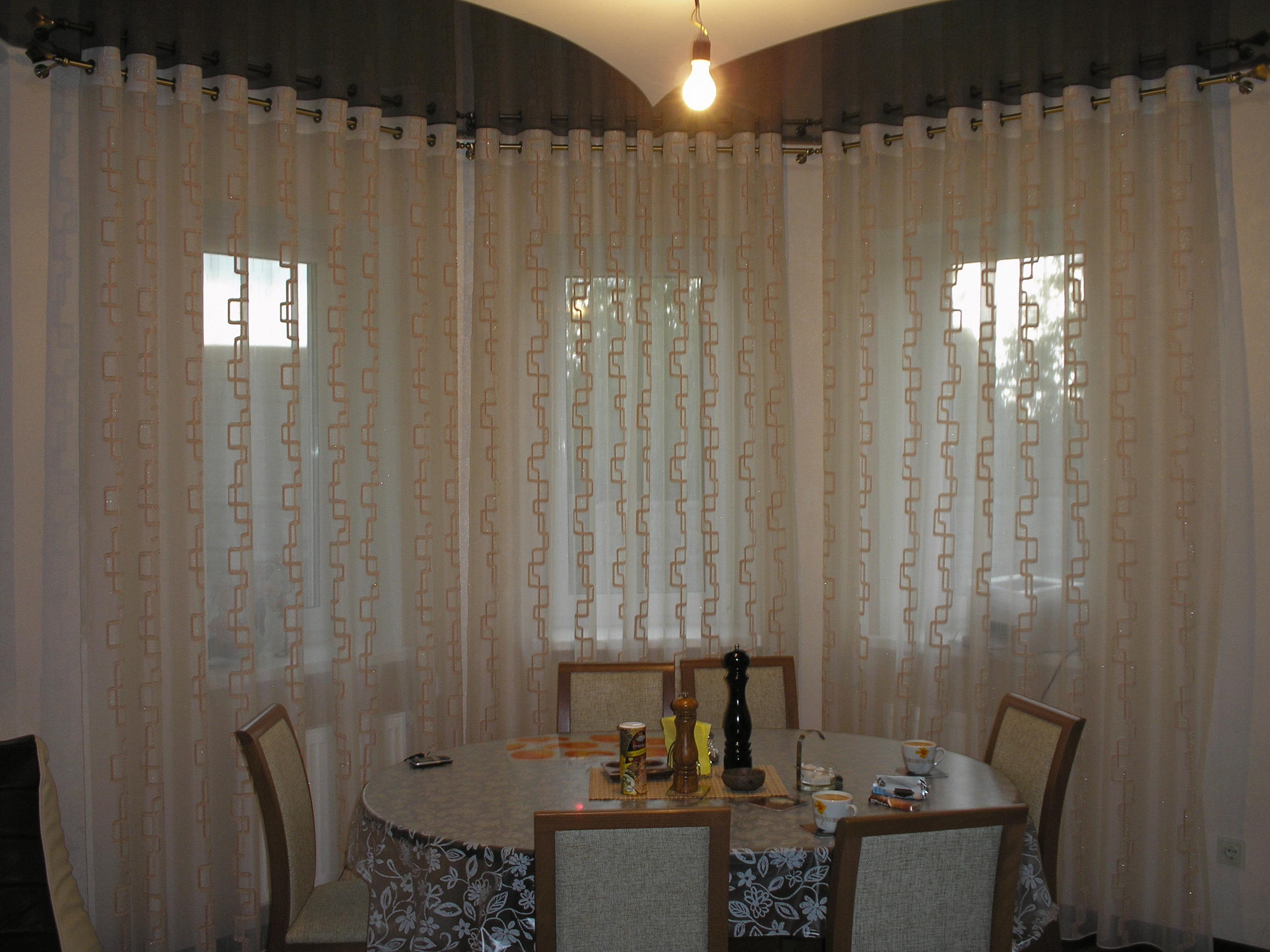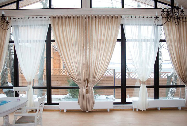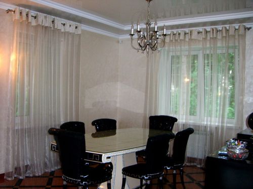 - If tulle is combined with fabric, then here you can go in two ways: either use a double curtain rod, or use a double curtain scheme. The easiest way to use two eaves.Tulle itself is put on the bottom one, and the second one has thicker curtains.