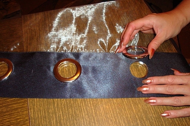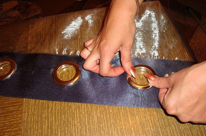 - Now it is necessary to put the grommets on the eaves, at the same time distributing the curtain over its entire length until beautiful folds are formed, if they are provided or until the curtain lies flat.