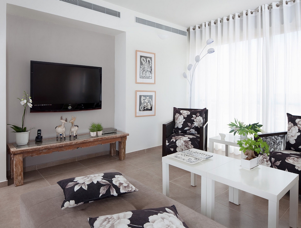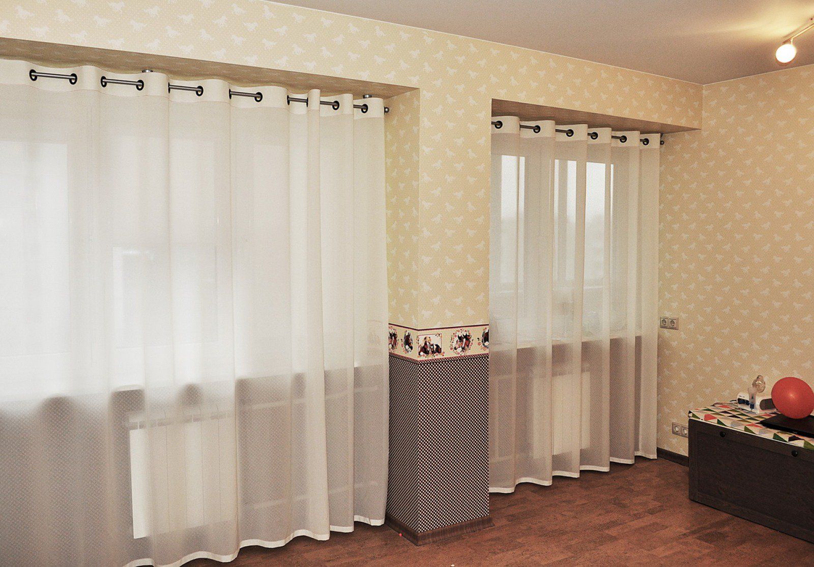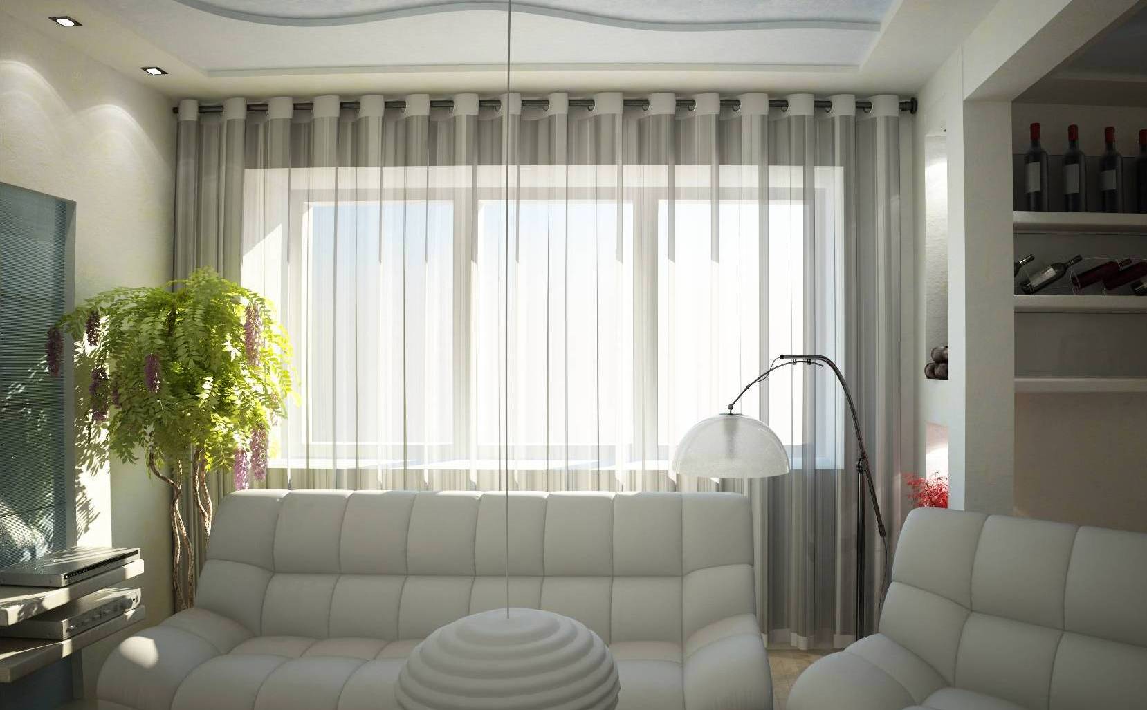 - Another vivid example of how the tulle on the grommet becomes not only really stylish and beautiful design of the window, but also helps to visually expand the narrow living room.The double decoration with tulle makes the window beautiful and elegant, and the simple white color advantageously enlarges not only the windows, but also expands the room itself.
