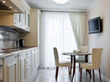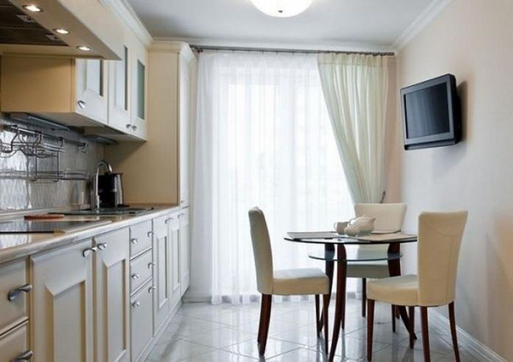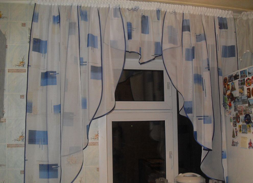 A good option for window decoration in the kitchen is matte fabric with small squares. You can also combine different colors of tulle-veil.