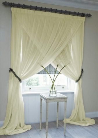 - Crossed from two canvases. In this case, the curtains are also rectangular. They can be both short and long.Tulle-voile cloths are assembled with various accessories on the opposite side of the window.