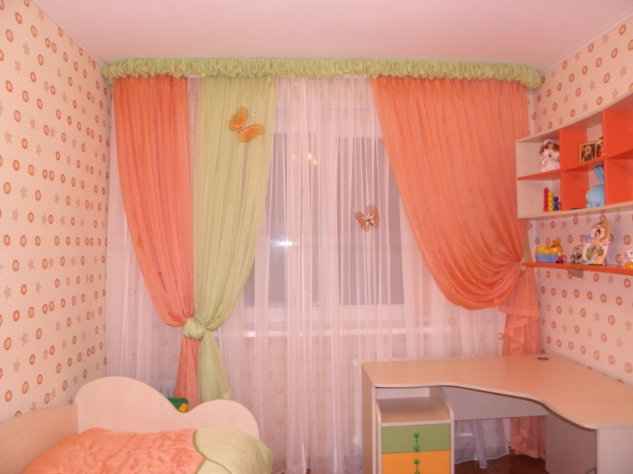 With the help of lambrequin shuttlecocks, you can turn an ordinary room into a princess bedroom. It is also appropriate veil with photo printing, which depicts cartoon characters.