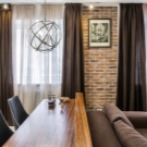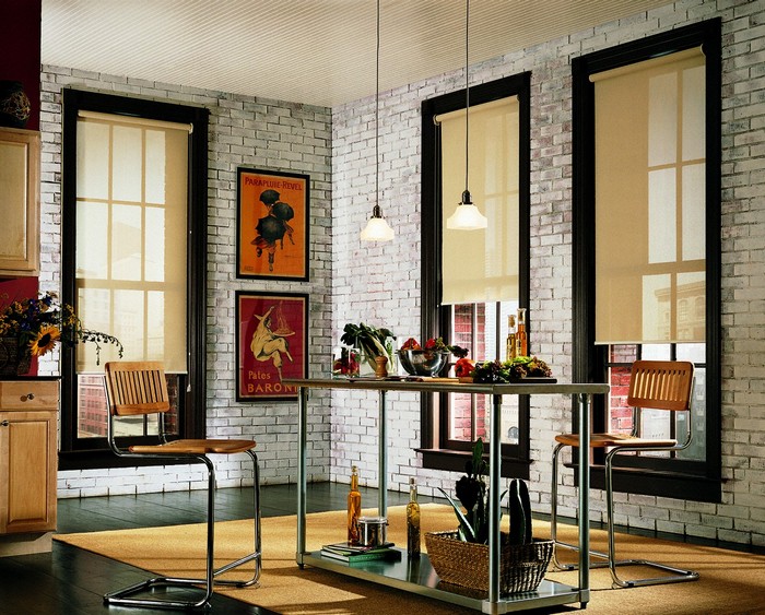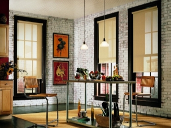 - The kitchen-dining room is equipped with a blackout panel., representing the same horizontal curtain, but capable of absorbing up to 90% of the whole world. This curtain takes up very little space and visually looks very attractive. Using it, kitchen owners can “hide” from the whole world and arrange, for example, a romantic dinner by candlelight. By the way, the choice of warm yellow lighting in this situation is not accidental, because with full light insulation from sunlight, such lamps are able to create an extraordinary atmosphere.