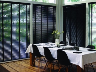 More often, for the design of the kitchen are chosen horizontal blinds. They are practical, easy to use. There are many models on the market that differ in size, type of control, and price. So, models with electric drive on automatic control will be much more expensive than classical mechanical structures, however, if your kitchen is equipped with skylights, the purchase of such blinds is simply necessary.