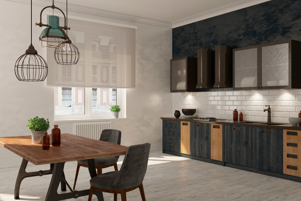 If you still want to add a bit of coziness to the room, using a cloth in the window design, better opt for roman blinds. Such curtains with a lifting mechanism save space and it is much easier to control them. Moreover, setting the Roman blinds away from the stove will reduce the risk of staining and spoiling them to a minimum.