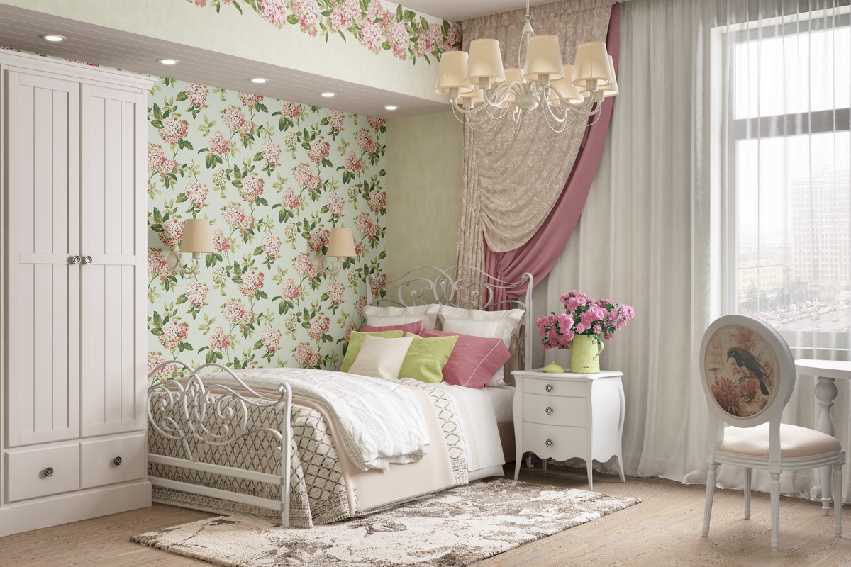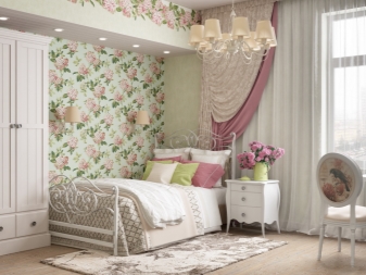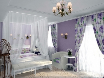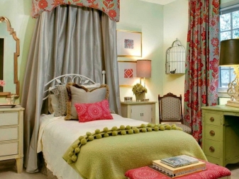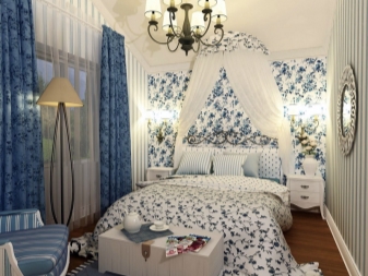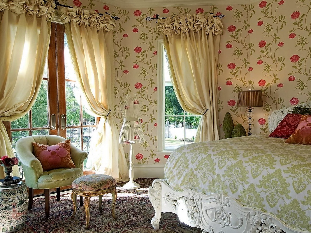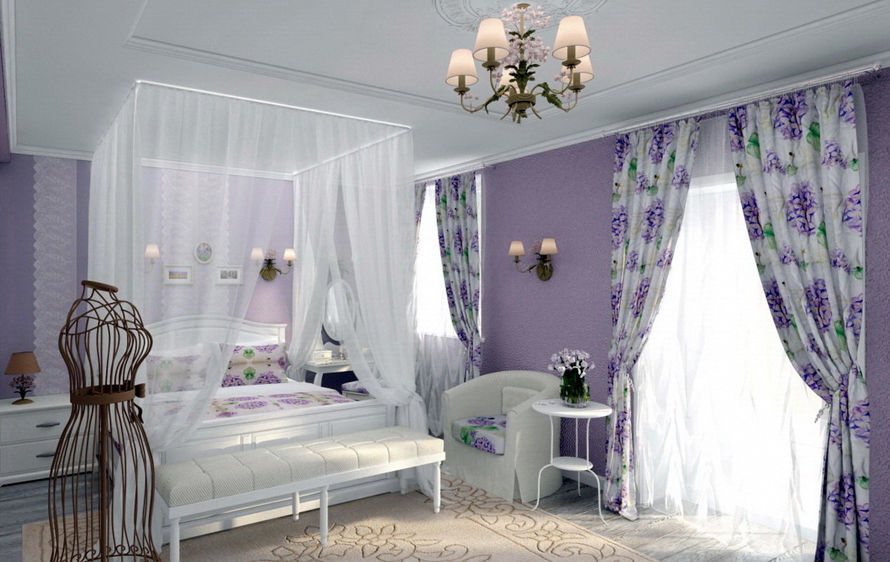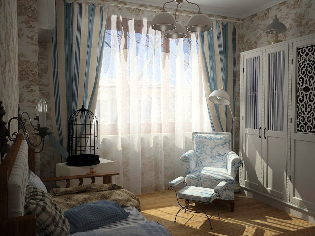 - For the bedroom is well suited option with lambrequin. Curtains are usually made quite long, but do not reach 2-3 cm on the floor. If the bedroom is small, one curtain instead of two will look great. By the way, Austrian, Roman, “London” curtains with Provence patterns are perfect for the bedroom. They will save space and will look original.In the bedroom and living room is best to prefer fabrics with floral padding or plain.