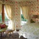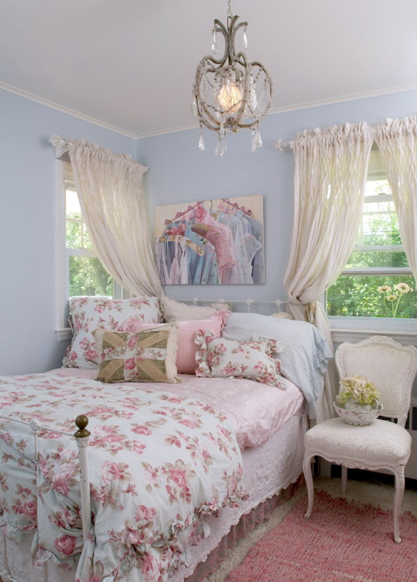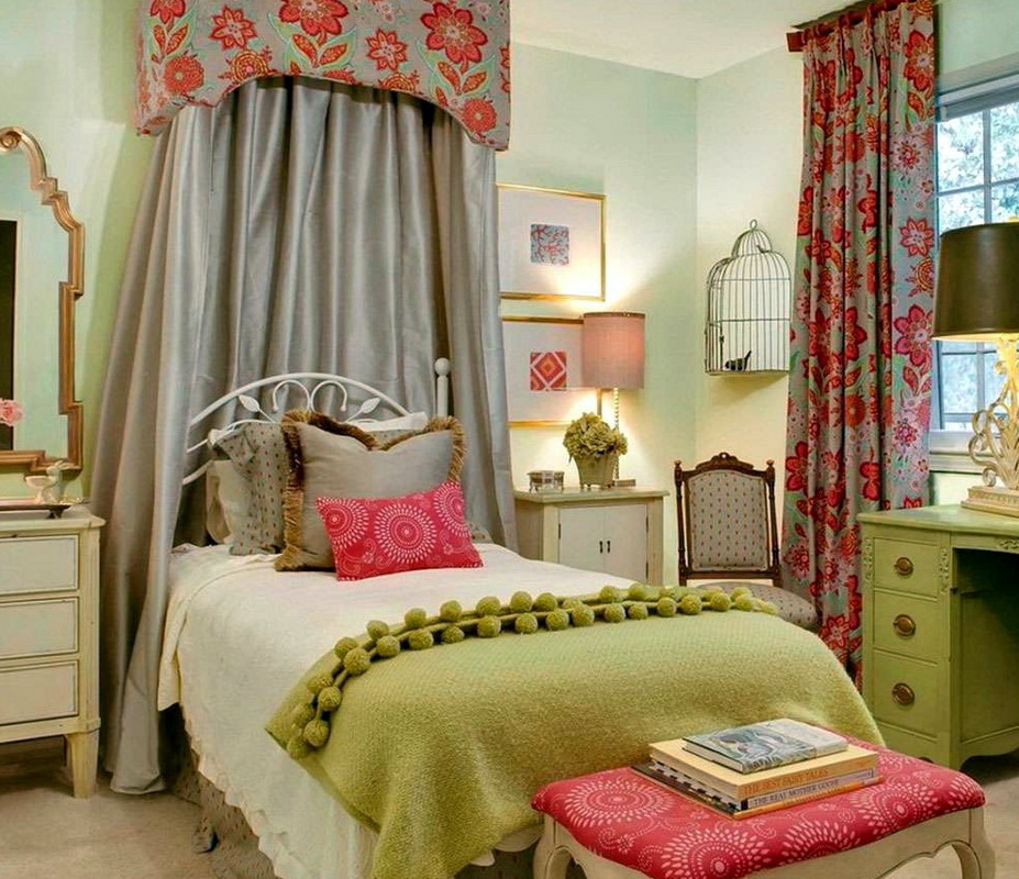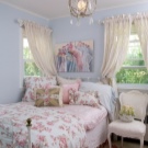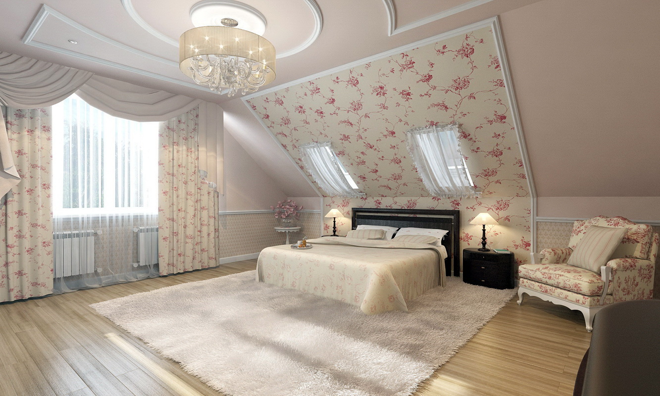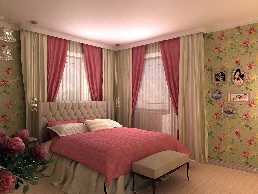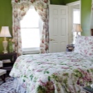 - For the bedroom is well suited option with lambrequin. Curtains are usually made quite long, but do not reach 2-3 cm on the floor. If the bedroom is small, one curtain instead of two will look great. By the way, Austrian, Roman, “London” curtains with Provence patterns are perfect for the bedroom. They will save space and will look original.In the bedroom and living room is best to prefer fabrics with floral padding or plain.
