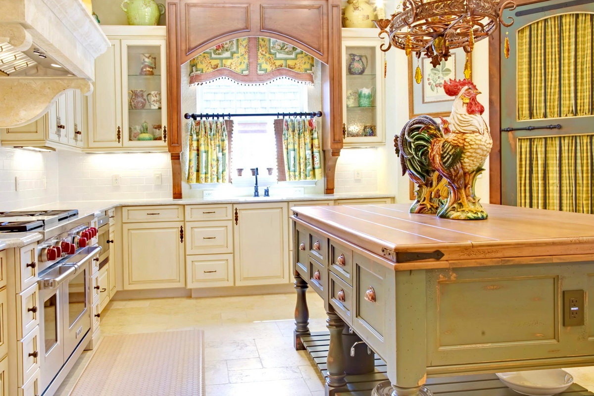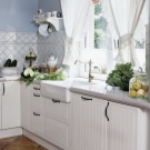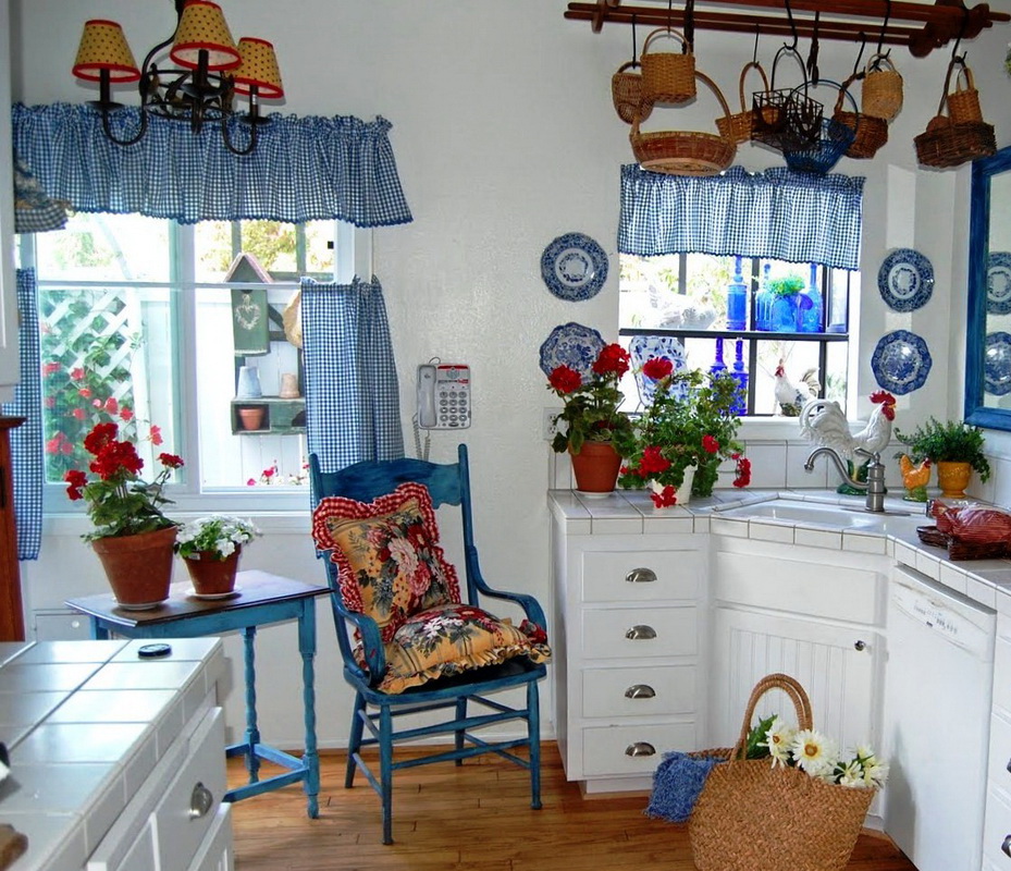 French country suggests even simplicity, but impeccable taste. Therefore, you need to carefully consider the combinations and not to overdo it. For example, if you want to make a kit (like the ones listed above), you shouldn't get too carried away. One or two items in the same textile solution will be enough. The rest of the interior should only echo this motive, but not repeat it completely. For example, if you have white-blue curtains in a flower in the kitchen and pillows on chairs from the same material, the tablecloth should be just white with a thin blue stripe.You can put on the window sill monochromatic blue jug.