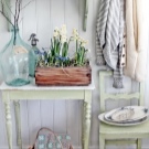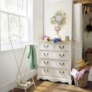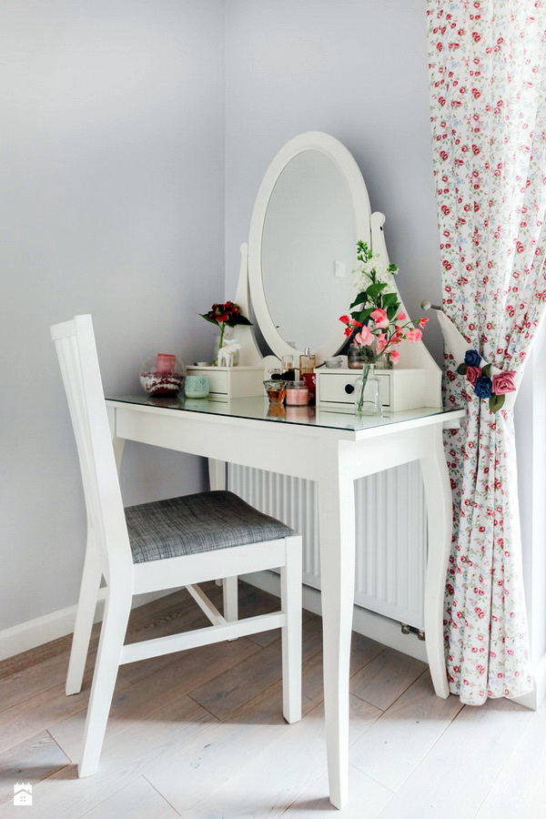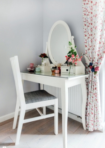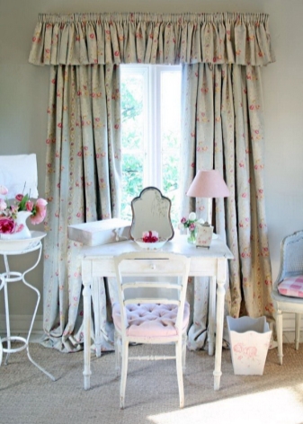 - Corner with a dressing table in the bedroom - this is very Provencal! A small window is decorated with simple curtains, similar in color to the color of the walls with printed floral patterns. A simple but tightly assembled pelmet creates a sense of completeness. Harmony in the interior is achieved with the help of a bouquet that stands on a stand - it perfectly complements the drawing on the curtains.