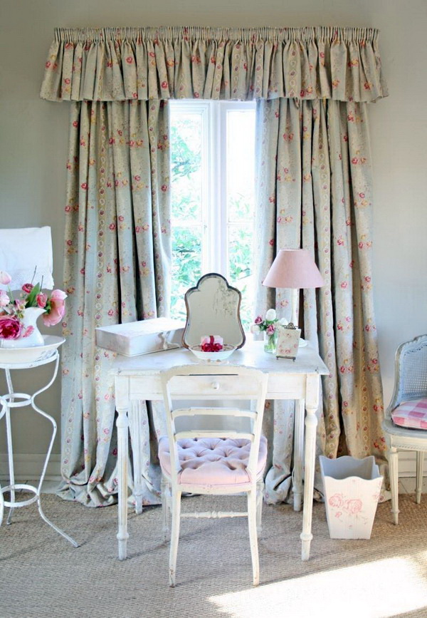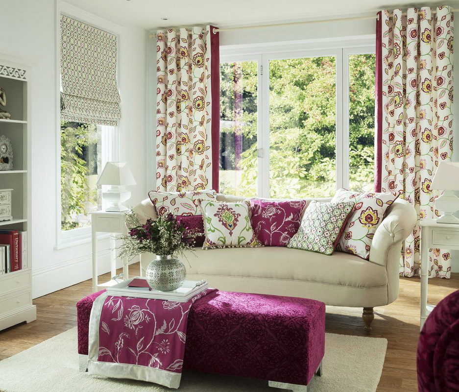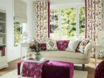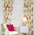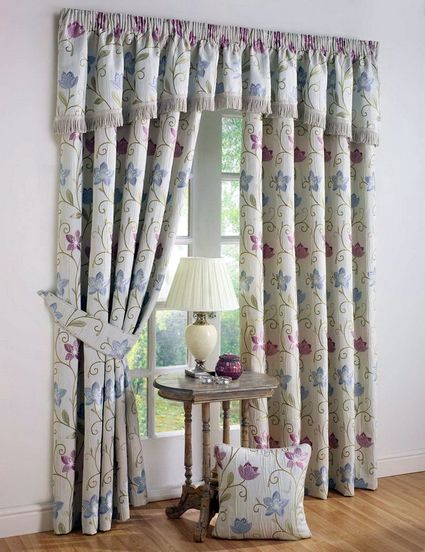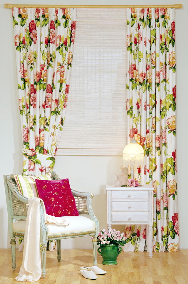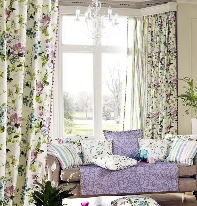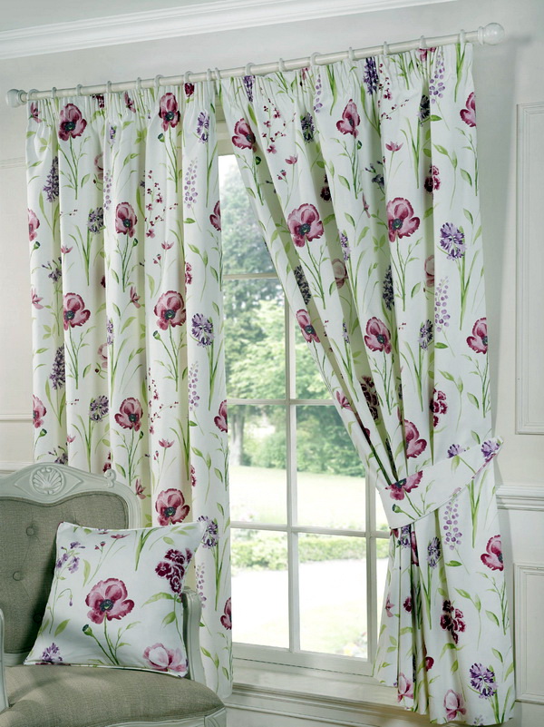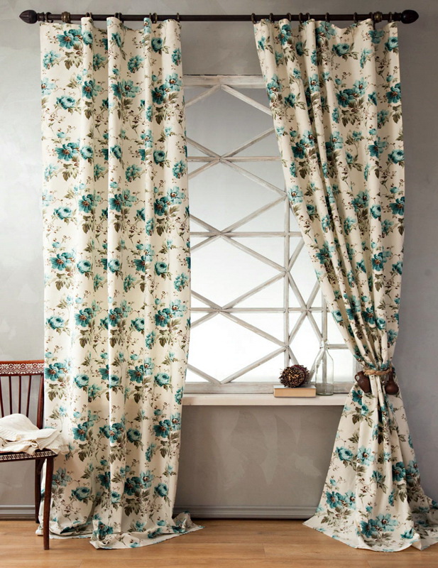 Background curtains can also be beige, light gray, pale blue, dusty pink, sandy, mint lilac. On all these shades floral pattern will look perfect.
