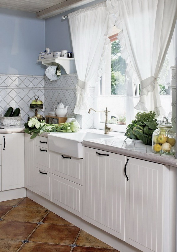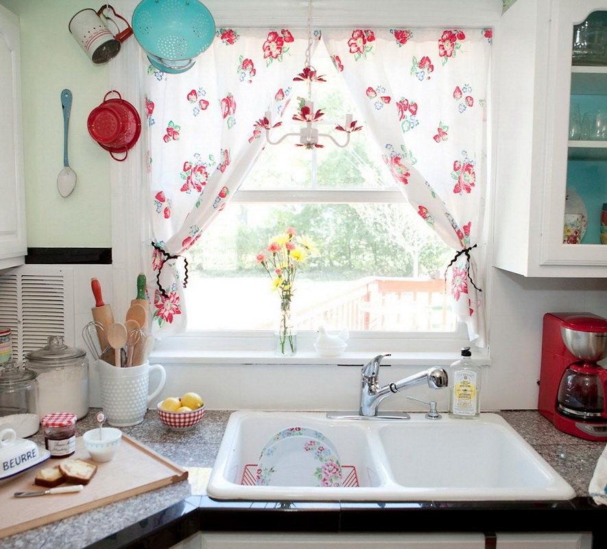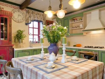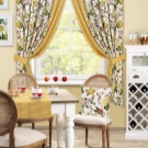 - For the kitchen, as already stated above, different lengths are suitable, depending on the size. If it is absolutely tiny, the best option is a curtain-cafe or one short (up to the window sill) curtain. Floral motifs will also be appropriate here, although you can easily add a small cell, a pattern of stripes, pastoral prints (shepherds, lambs, a Dutch mill), a drawing on food (vegetables, fruits, lavender, bouquets of Provencal herbs), and coffee. Fabrics on which rapport is drawn from various Provencal herbs with inscriptions (“Cumin”, “Lavender”, “Basil”), etc. are very common.