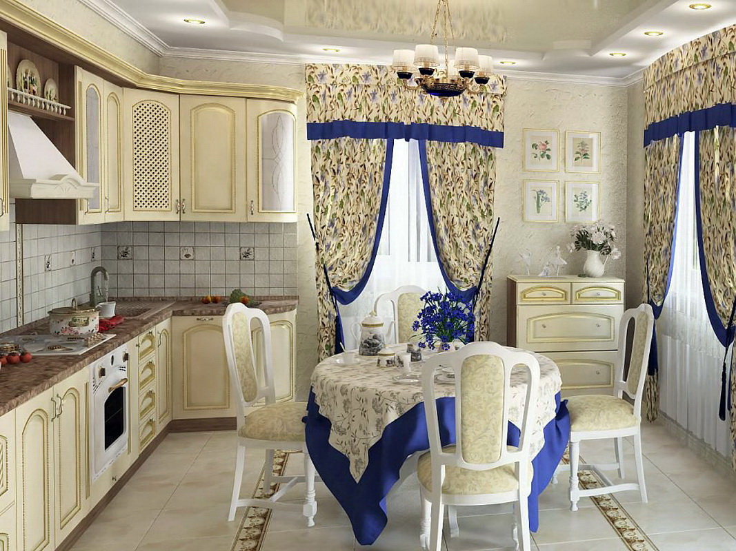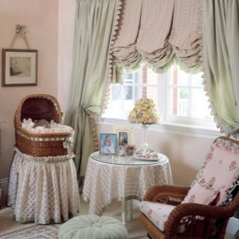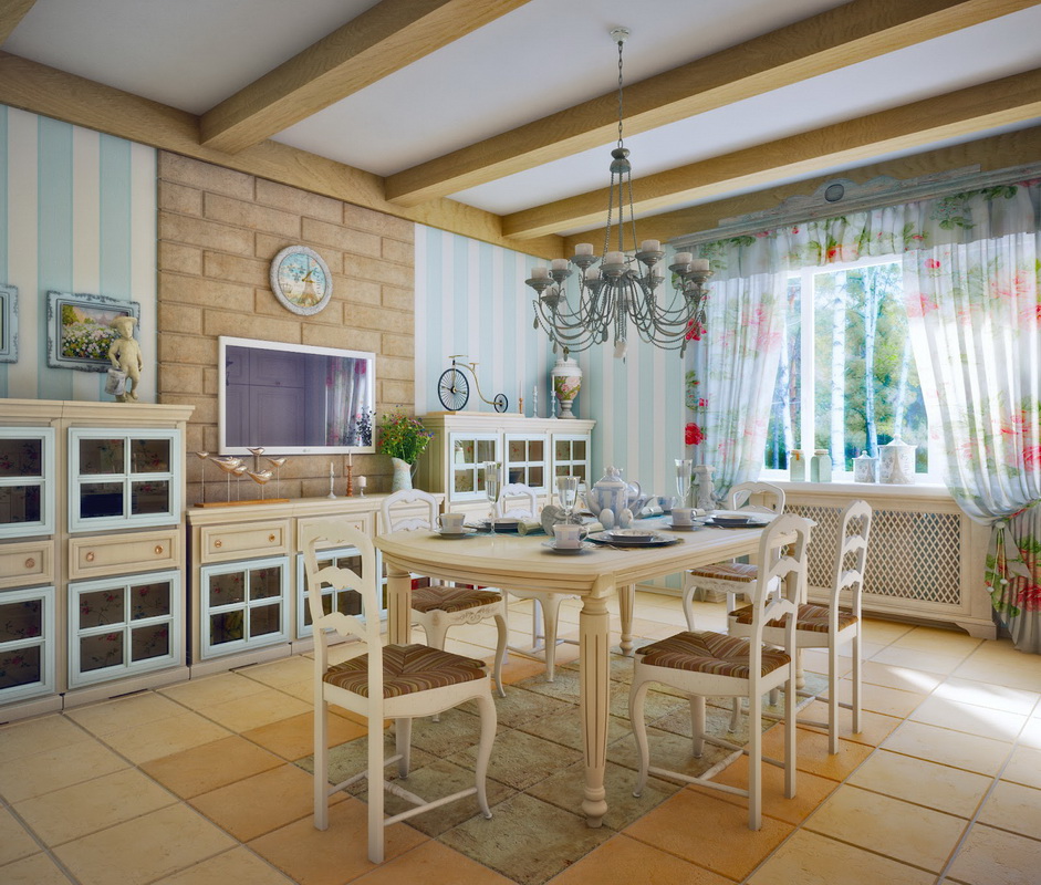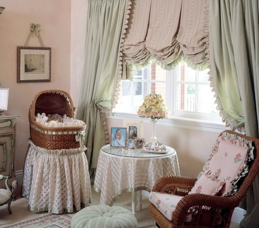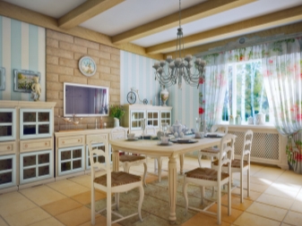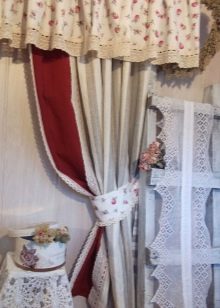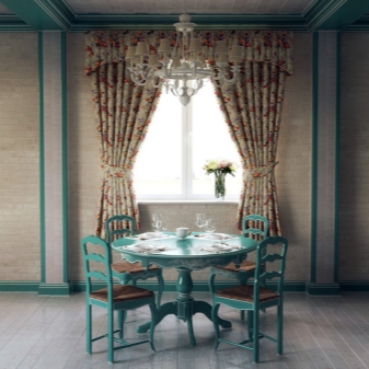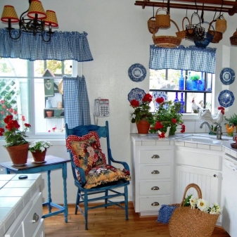 Provence can be both elegant and simple. Both are good in their own way. A simpler design is suitable for the kitchen, but for a bedroom or living room you can make the style festive. For this useful accessories. Provencal curtains can be added with lambrequin (simple, short or with semicircular folds), hooks, ruffles and lace,satin ribbons, bows. It is better to refuse cords, brushes and other “pomp”: the decor should be tasteful.