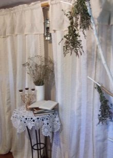 Any rustic style perfectly complements flax. Rough, but nice looking linen fabric will drape well and perfectly protect from the sun. Today, you can choose beautiful multicolored linen options for curtains, but the most beautiful and authentic option is unbleached linen. A curtain of flax natural gray-brown shade will look very impressive. It can be supplemented with hemstones, wide lace, embroidery or short linen fringe.