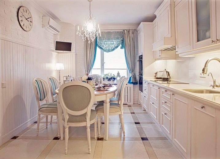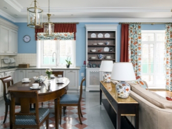 - In the spacious kitchen, the walls are decorated with a floral pattern, and the window is covered with light white curtains. To ensure the density, the window opening is additionally covered with a Roman curtain. Her drawing does not repeat the rapport on the walls - a striped curtain, but it is kept strictly in the white and blue colors. Chandelier and panels on the wall serve as additional color accents.
