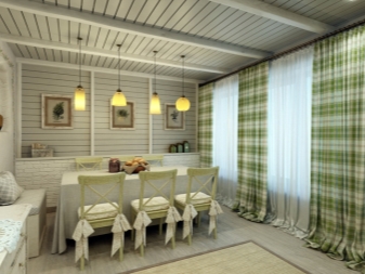 Another “Provençal” version of the drawing is a small, delicate cage or equal stripes (colored strip - white strip). Such curtains can be both solo, and combined. For example, you can combine a fabric in a cage or a strip with a material in a flower or monophonic.