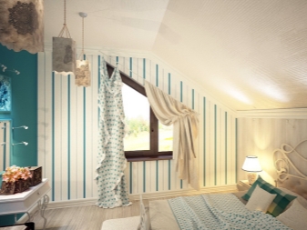 - If you want to decorate a window on a sloping wall (for example, under a roof), simple curtains a little longer than a window are best suited. On the bottom edge, they must be attached to the wall. For each, you can make textile pick-up with velcro or strings.