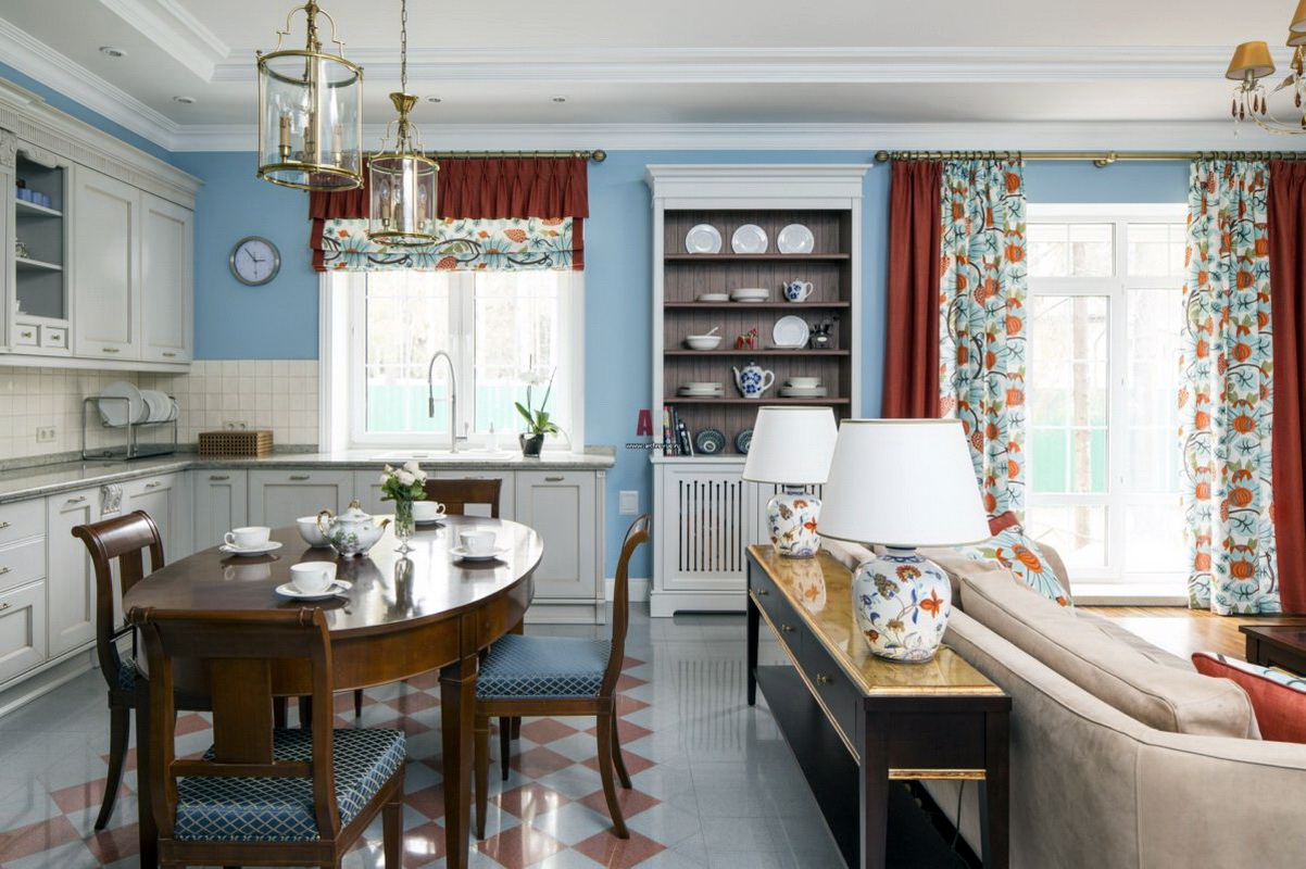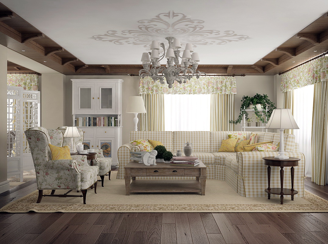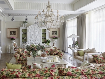 - Luxurious large living room with large windows in Provence style. Latticed glass creates a retrospective. The designer chose white curtains with a large floral pattern in yellow and blue colors. Lambrequin without assemblies, but with a figured edge.