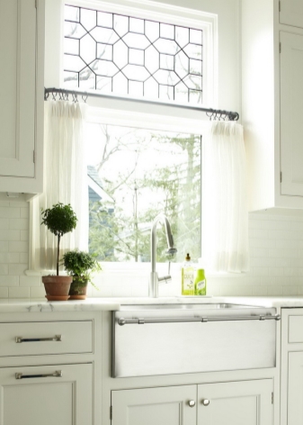 - A small window in the kitchen of a country house looks very tender with thin and small curtains in the center. The simplicity adds a mount to ordinary metal rings. The top of the window is decorated in stained glass technology.