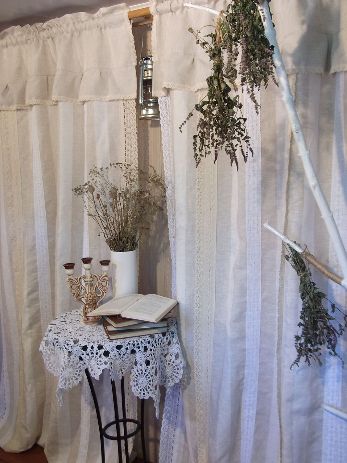 Plain curtains are also a viable option. They can be “revived” with printed tulle or accessories and lace.