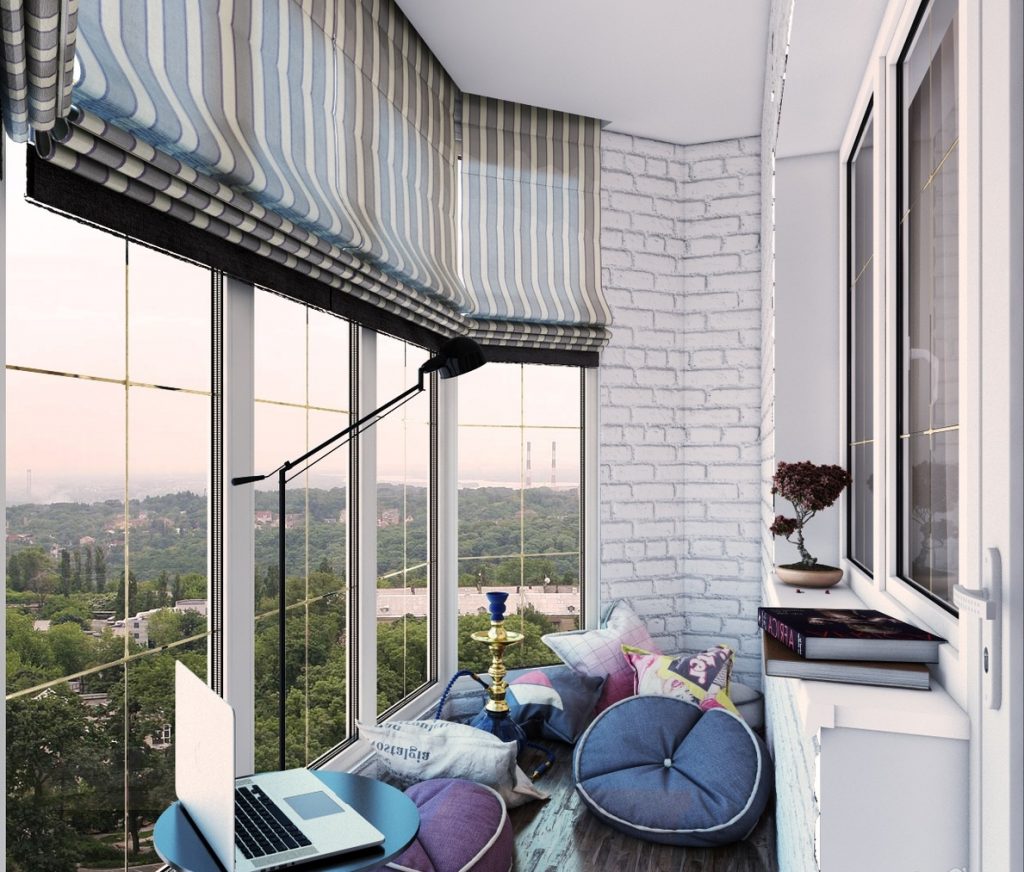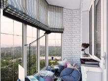- Loggia can be equipped with overall models of blinds or cozy curtains in rural style. Sometimes tulle designs are used as balcony curtains, but they are subject to more pollution.