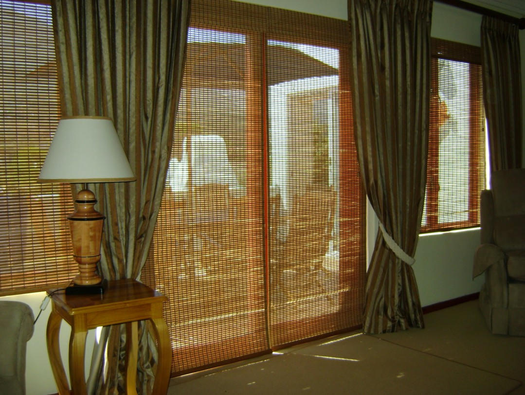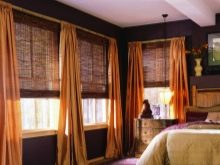 - The same assembly methods are inherent and bamboo curtains. Such curtains are presented in the form of a smooth canvas, created from interwoven bamboo fibers. This material is environmentally friendly and very original for the design of the room.